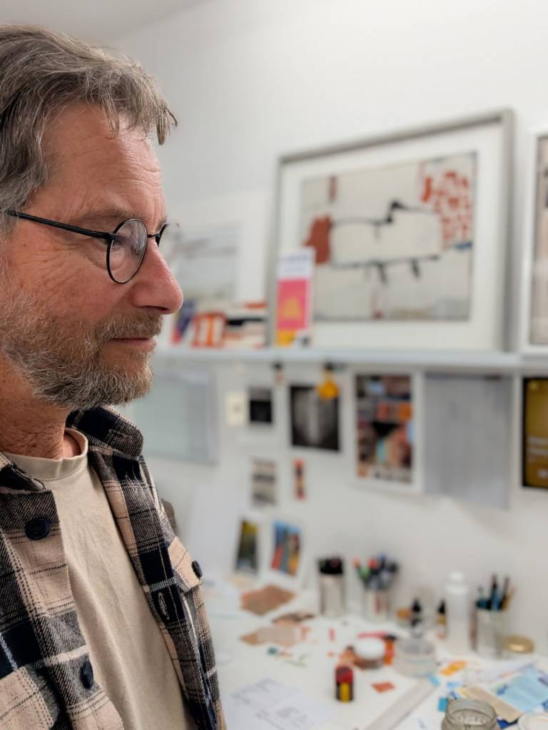 Chris tends to work in series, following through themes. This helps the flow of work from one piece into another. Recent series have been titled “Ordinary Icons”, “Defragmentations”, “Edge of Knowing” and “Langona” (meaning longing). Studio practice varies very much from one day to another, depending on what needs doing – generating new ideas, perhaps by being out with the camera or working in sketchbooks; pushing ideas towards something resolved; covering the studio surfaces with numerous pieces being worked on together, finalising and fixing collages, reviewing, completing, framing, photographing, cataloguing, preparing for exhibitions etc. Though it may seem organised, the process is mostly intuitive. He usually works to music, finding this helps him enter a “flow” state more readily.