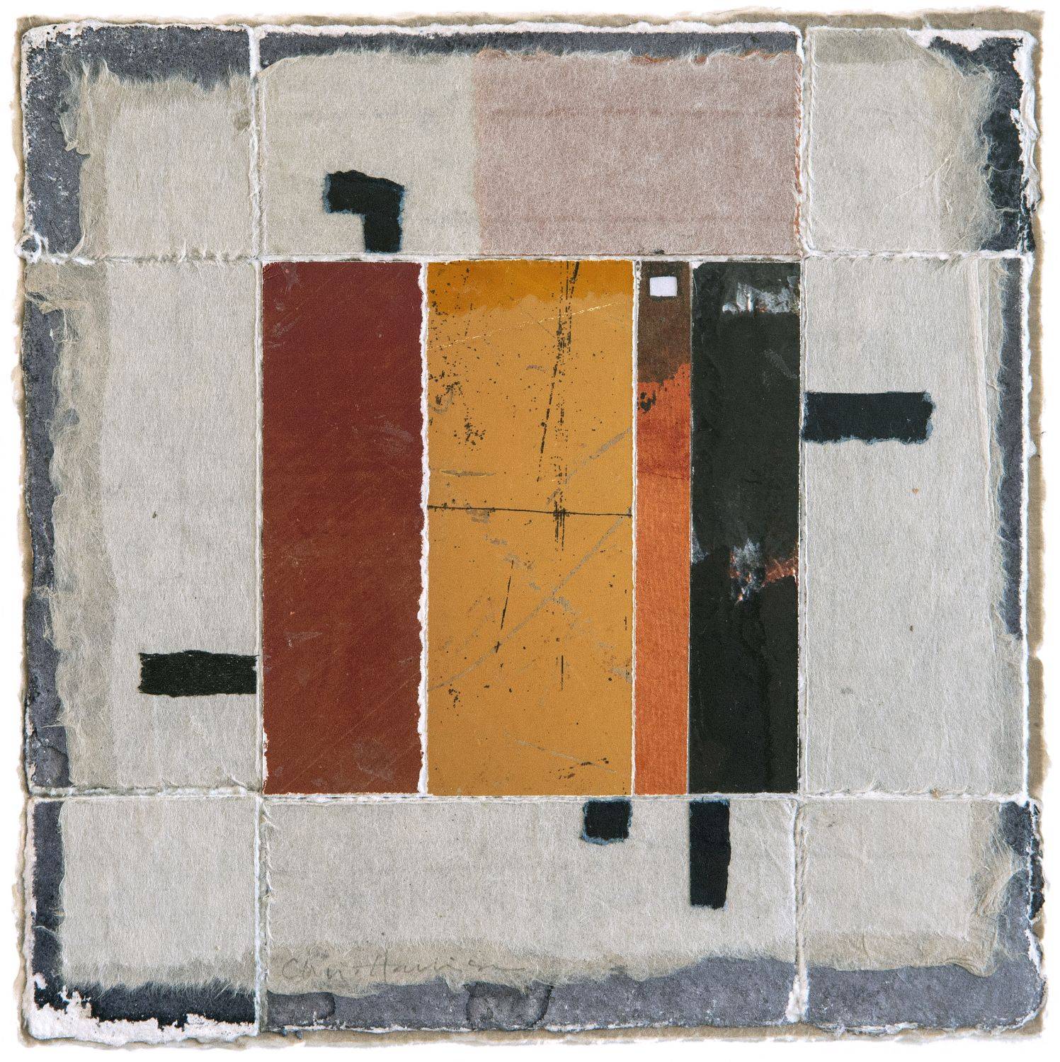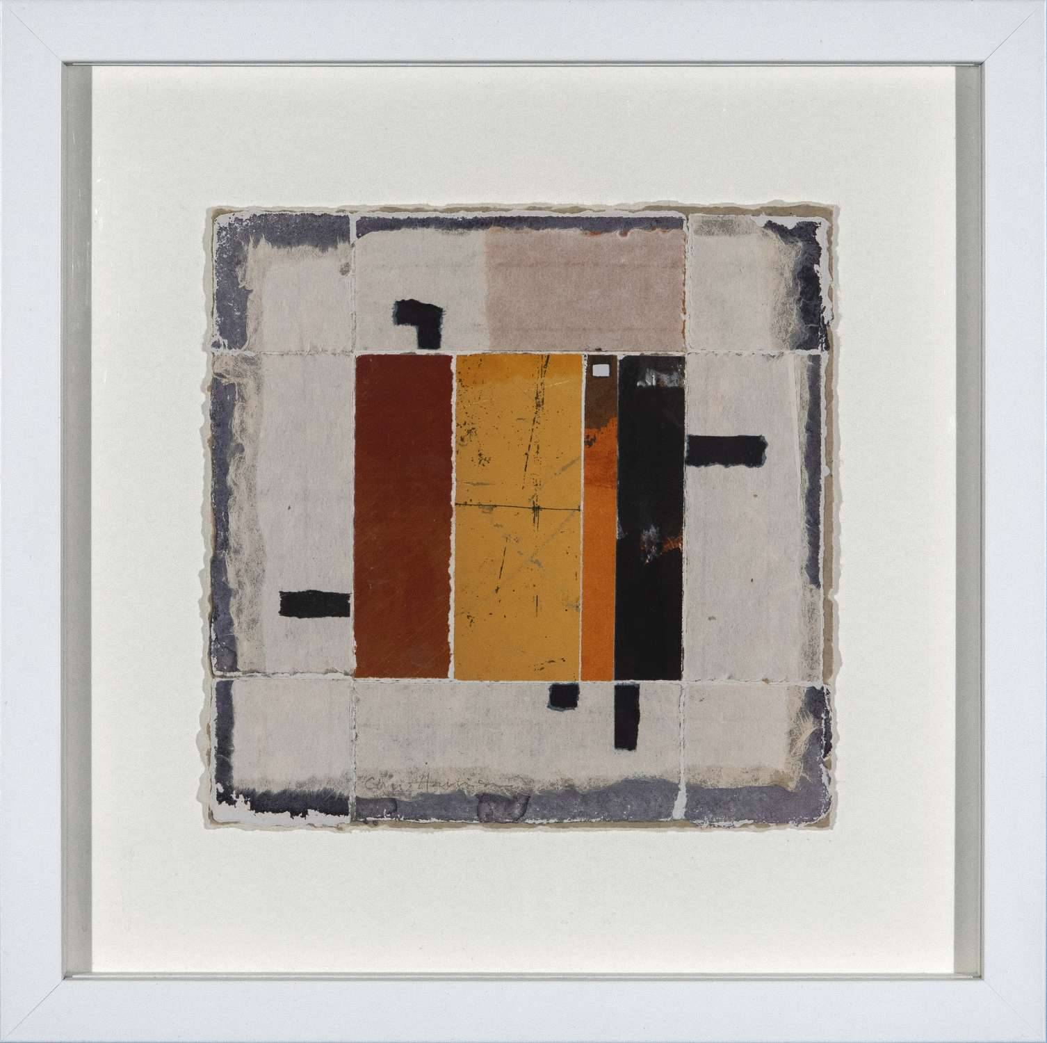 Mixed media collage on paper using handmade papers, inks, acrylics and photography. Mounted in conservation materials, framed and glazed.