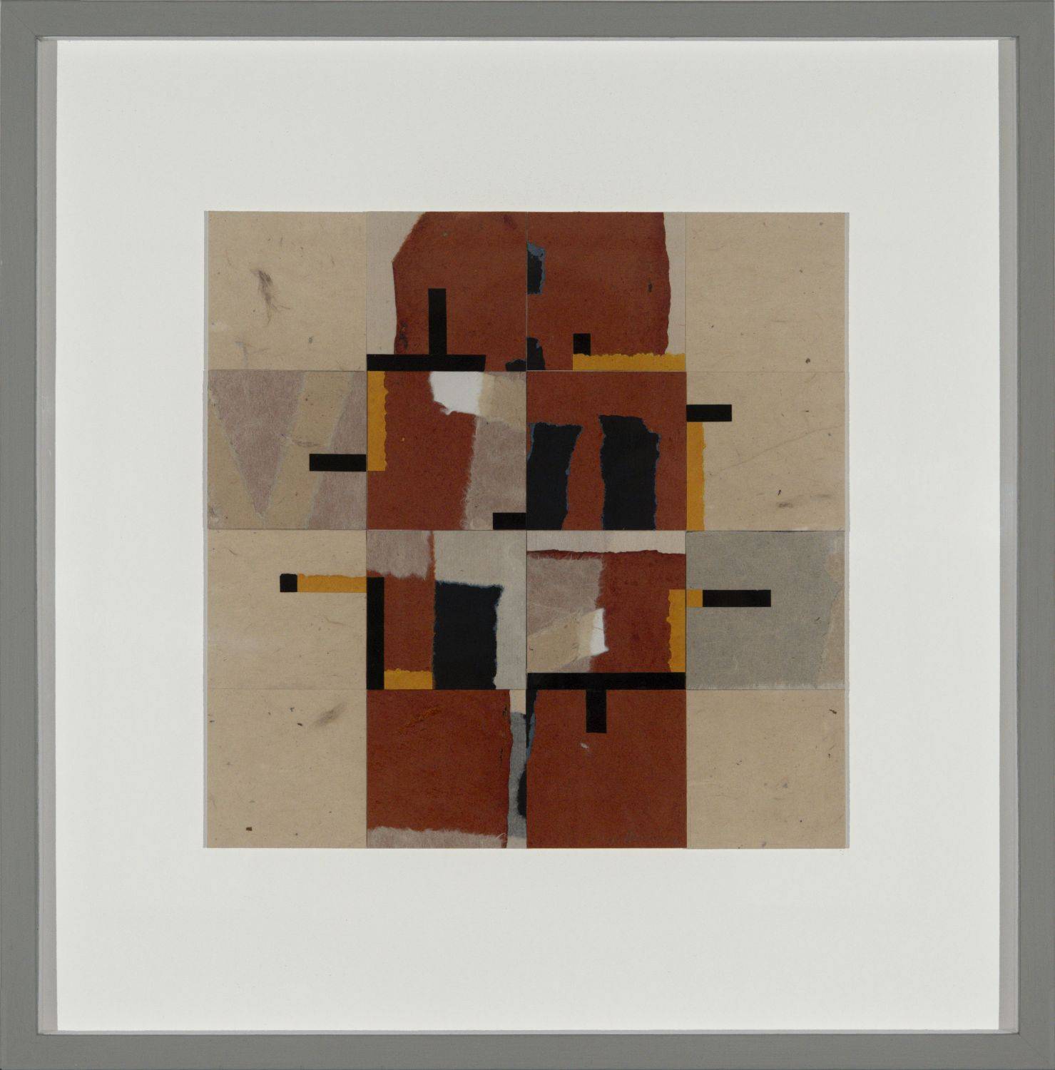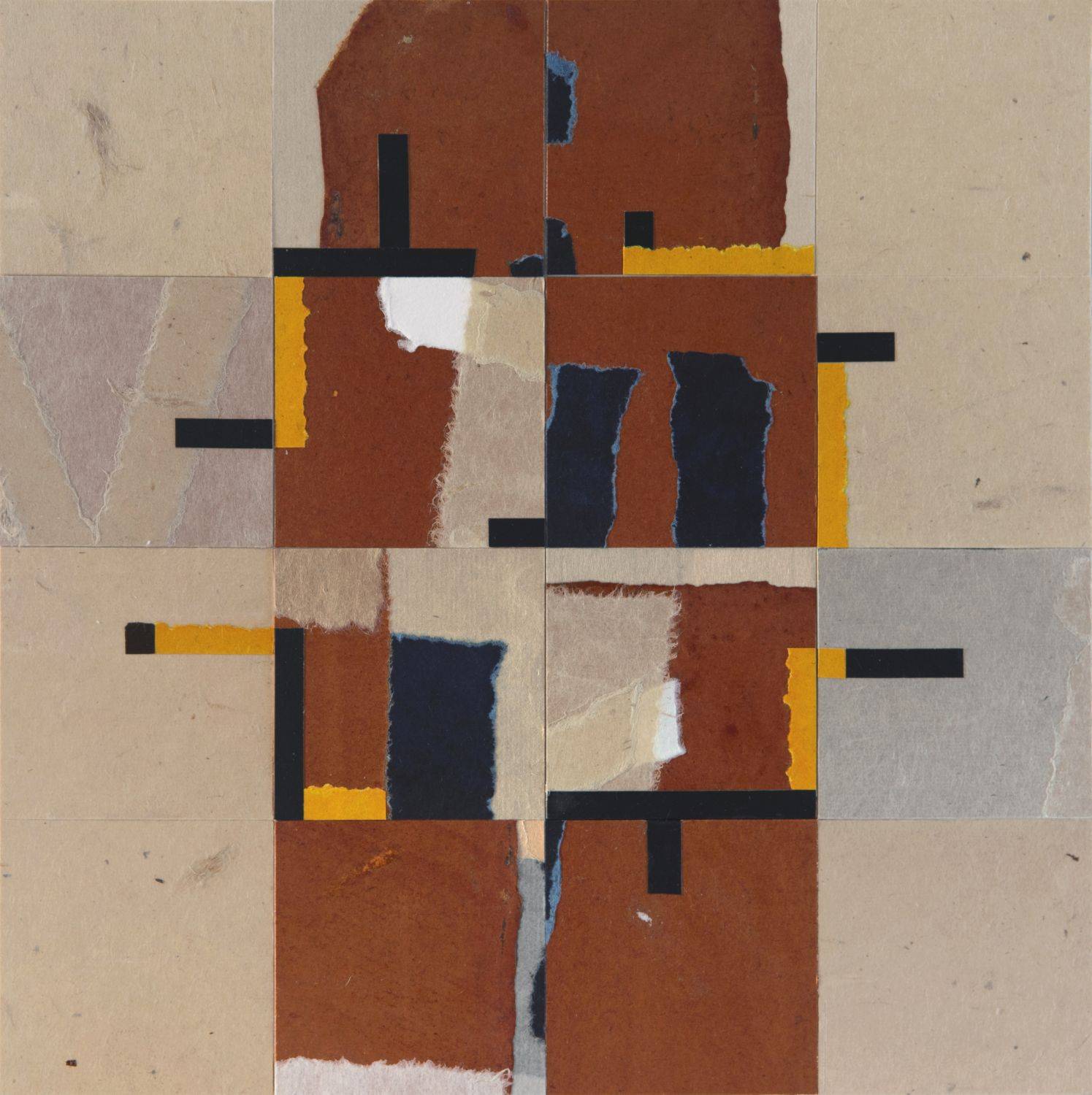 Mixed media collage on board using handmade papers, inks, and acrylics.