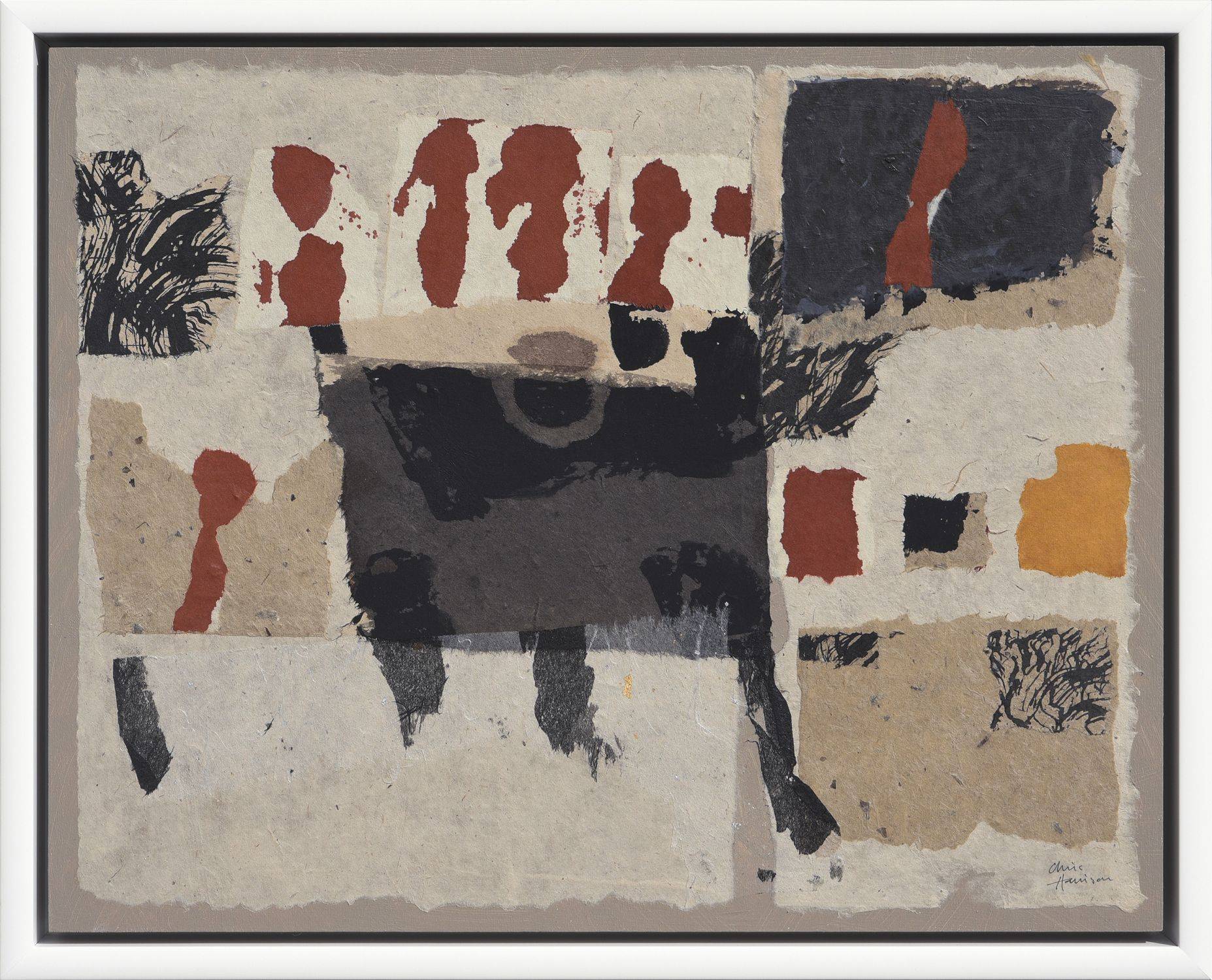 Mixed media collage with inks, acrylics and handmade papers on deep cradled panel, framed in white tray frame.